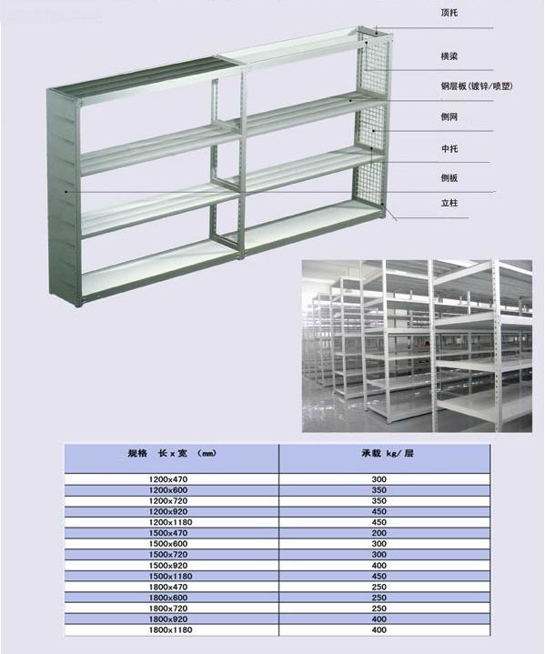 中量A型貨架,中量型貨架,擱板式貨架結(jié)構(gòu)和參數(shù)對照表